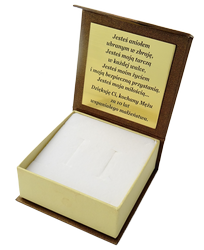 Towar zapakowany w bardzo eleganckie pudełko zamykane na magnes. Spraw ,aby Twój prezent był naprawdę wyjątkowy. Specjalnie dla Ciebie wykonamy gratis dowolną dedykację na specjalnej tabliczce umieszczonej wewnątrz pudełka. Całość z pewnością nada elegancji i oryginalności Twojemu podarunkowi. Grawer wykonany jest techniką laserową nie ma obaw o utratę jakości. Pudełko do wyboru w 3 wersjach.1: brązowe - standardowe , 2: białe - Chrzest Św. , 3: białe - Komunia Św.